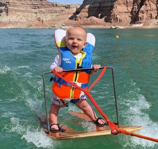 Rich Humphreys仅6个月零4天,他由父母带着在好意思国犹他州南部的鲍威尔湖上进行滑水。小家伙穿戴浮水衣站在滑水板上,他的脚安全地绑在木板上,双手扶着板上的金属杆,木板系在船上被逐渐拉动。他的爸爸Casey在另一艘船上和Rich系数前行,保护着他。