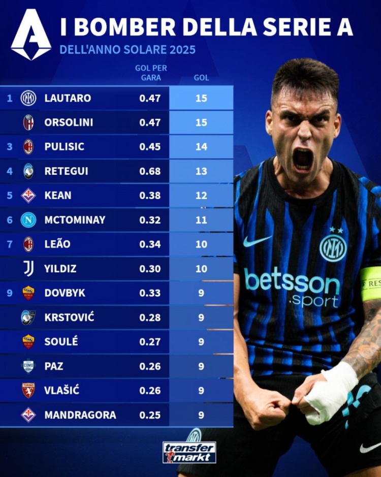 1月1日讯 德转列2025年意甲弓手榜,劳塔罗与奥尔索里尼15球比肩第一。