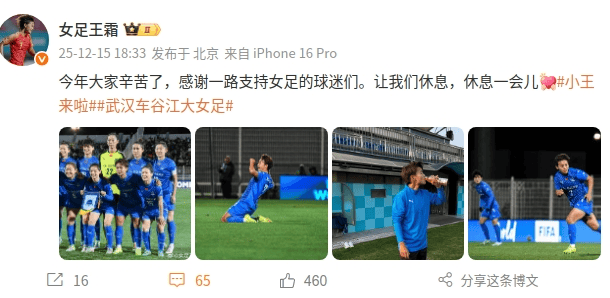 赛后,王霜在微博晒出相片并写说念:“本年公共贫苦了,感谢沿途撑握女足的球迷们。让咱们休息,休息斯须。”