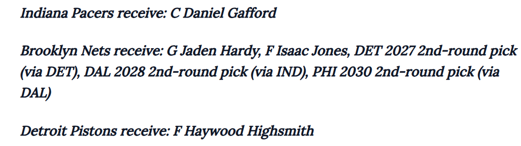 达拉斯独行侠:本内迪克特·马图林、中锋戴罗恩·夏普印第安纳走路者:丹尼尔·加福德布鲁克林篮网:贾登·哈迪、艾萨克·琼斯、2027年次轮选秀权(通度日塞赢得)、2028年次轮选秀权(通过走路者赢得)、2030年次轮选秀权(通过费城76东谈主赢得,源自独行侠)底特律活塞:海伍德·海史小姐